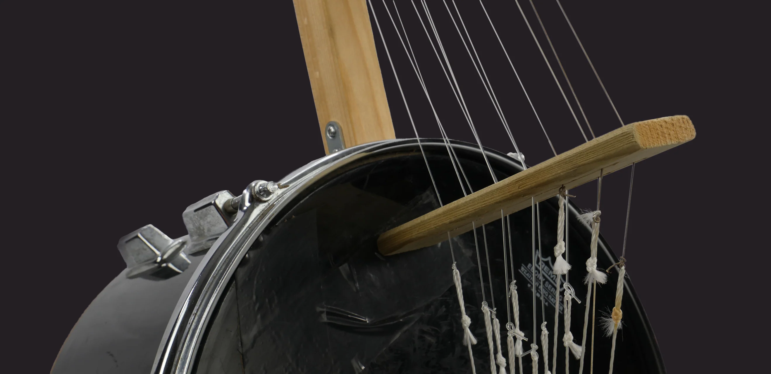 The Kora Drum is a custom instrument made by instrument maker, Nicholas Bras. Inspired by a Kora and a Kamele N'goni, two harp-lutes from West Africa, Bras replaced the calabash and goat skin used on the original with a body made from a tom drum, and 12 nylon strings.